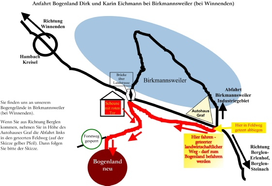 Sie finden uns an unserem Bogengelände in Birkmannsweiler (bei Winnenden). Wenn Sie aus Richtung Berglen kommen, nehmen Sie in Höhe des Autohauses Graf die Abfahrt links in den geteerten Feldweg (auf der Skizze gelber Pfeil). Dann folgen Sie bitte der Skizze.